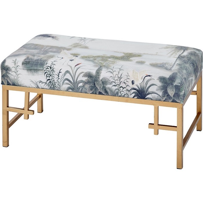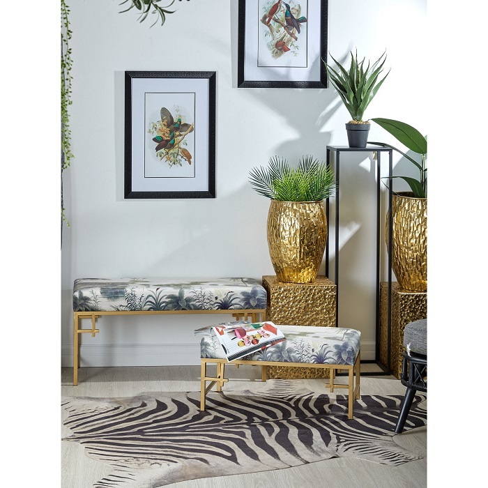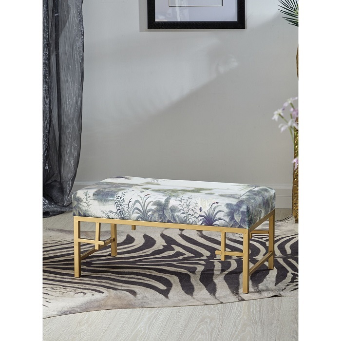 Удобная банкетка для гостей на металлическом каркасе, с приятной на ощупь велюровой обивкой в тропической расцветке. Это изделие станет превосходным дополнением в ваш интерьер.