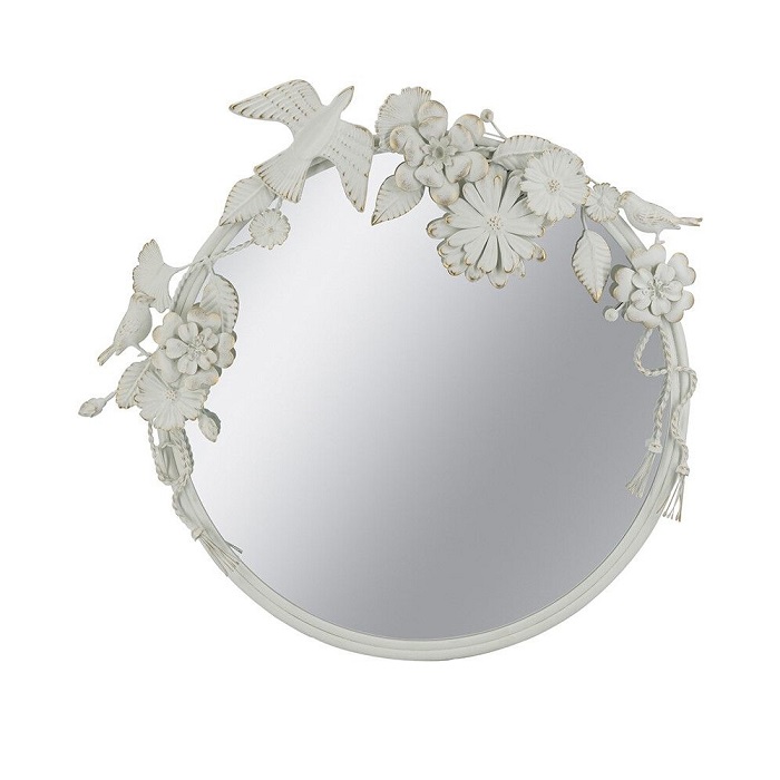 Изящное настенное зеркало, сочетающее в себе непринужденную природную красоту и винтажный шарм, представляет округлый силуэт, элегантную белую отделку с богато украшенным растительным декором и птицами в верхней части. Высококачественное стекло не только обеспечивает кристально чистое отражение, но и усиливает естественное освещение, создавая более яркую и уютную атмосферу, визуально увеличивая пространство любой комнаты и обстановки.