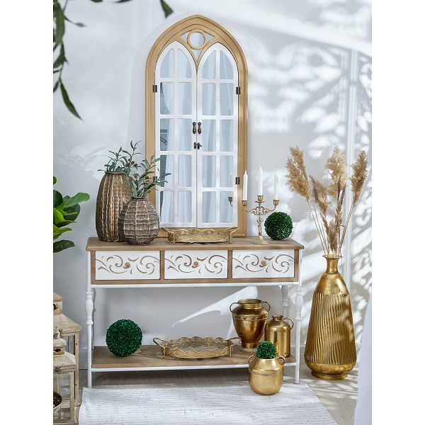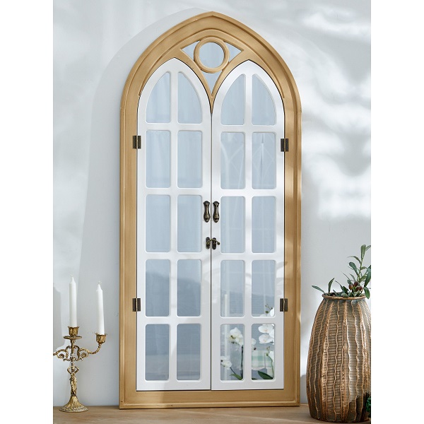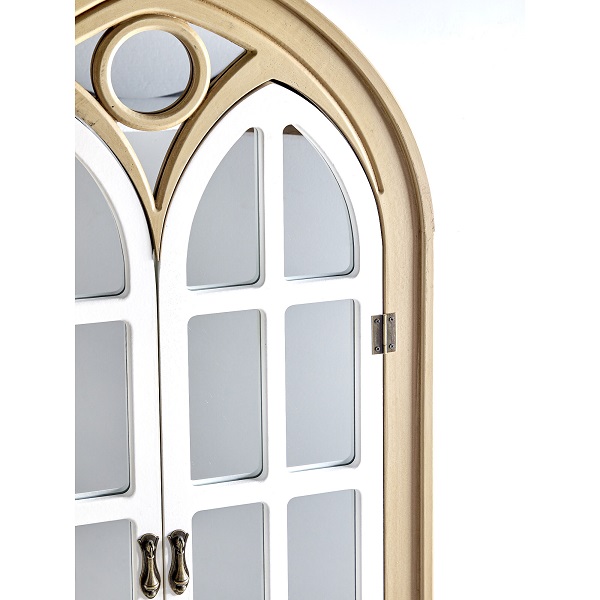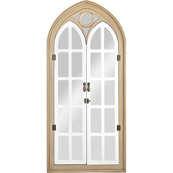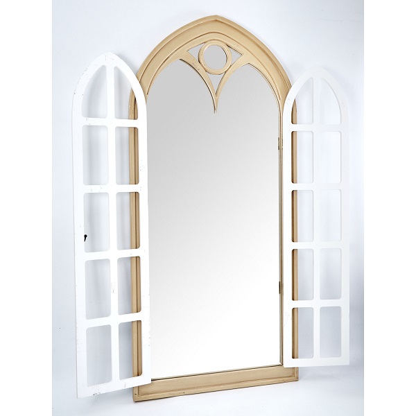 Настенное зеркало в виде дворцового окна с открывающимися ставнями, выполненное из натурального дерева и украшенное рамой коричневого цвета с белыми перегородками. Это изделие без сомнений займет центральное место и подчеркнет красоту вашей гостиной или спальной комнаты, визуально увеличивая пространство помещения.