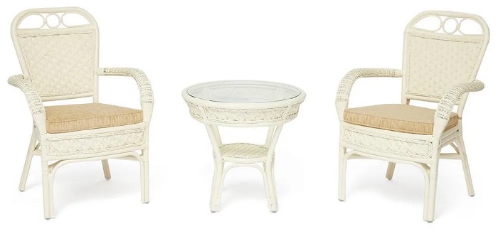 - Состав комплекта: стол кофейный со стеклом + 2 кресла + подушки