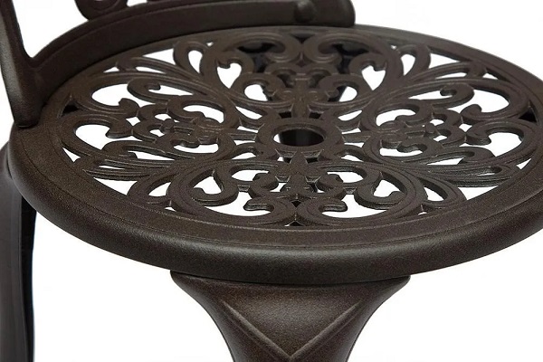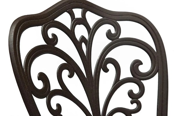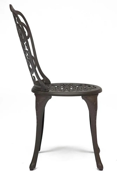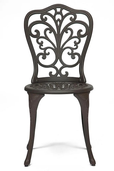 Стул Mozart изготовлен из литого алюминия. Эта модель декорирована крупным ажурным орнаментом и выполнена в цвете «темная бронза».