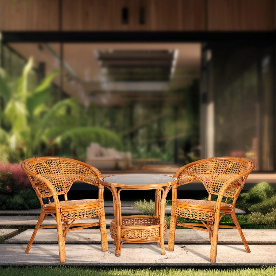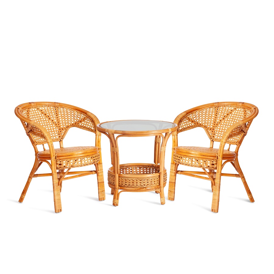 ТЕРРАСНЫЙ КОМПЛЕКТ "PELANGI" (стол со стеклом + 2 кресла) /без подушек/ ротанг, кресло 65х65х77см, стол диаметр 64х61см, Honey (мед)