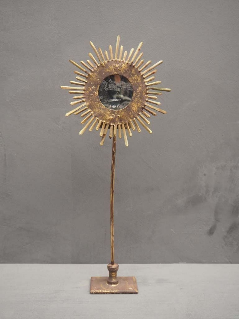 Подсвечник «Солнце» — это изысканный декоративный элемент, который станет ярким акцентом в любом интерьере. Его дизайн вдохновлен образом солнца: круглая основа украшена расходящимися лучами, создающими эффект сияния. Центральная часть выполнена из зеркала, что добавляет изделию легкости и визуального объема.